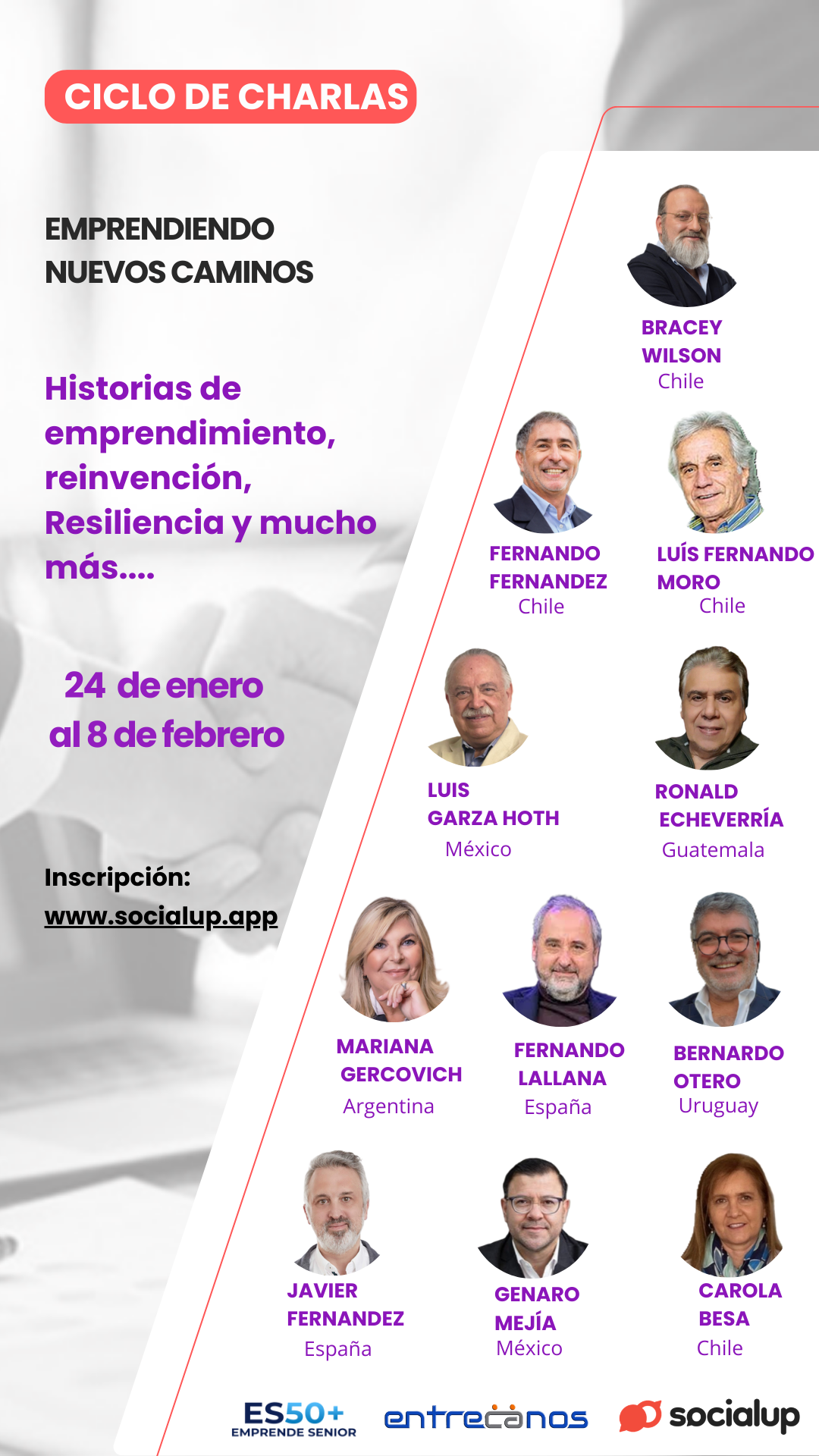 Con el objetivo de proporcionar herramientas a personas mayores de 50 años y facilitar la generación de ingresos económicos, Socialup está llevando a cabo una serie de charlas y conversaciones en colaboración con Entrecanos (México) y ES50+ (Chile). Estas sesiones incluyen la participación de oradores internacionales con quienes los participantes podrán dialogar sobre cómo comenzar un nuevo emprendimiento, la reinvención personal y la resiliencia.